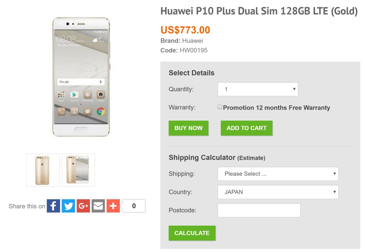 Uniqbe における「Huawei P10 Plus」の本体価格は $773(約 85,850 円)です。この価格での輸入概算総額は以下の通り。