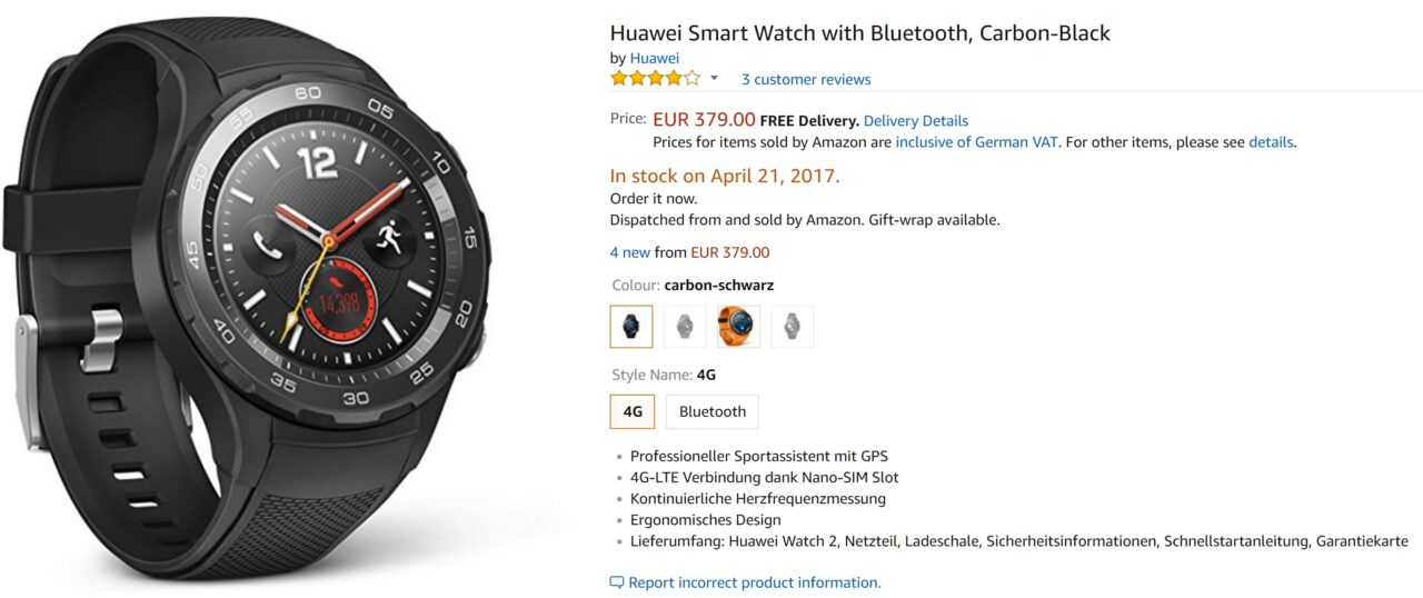 ちなみにヨーロッパ圏の Amazon の中でも「Huawei Watch 2」を最安に設定しているのはドイツの Amazon.de で日本直送に対応しています。