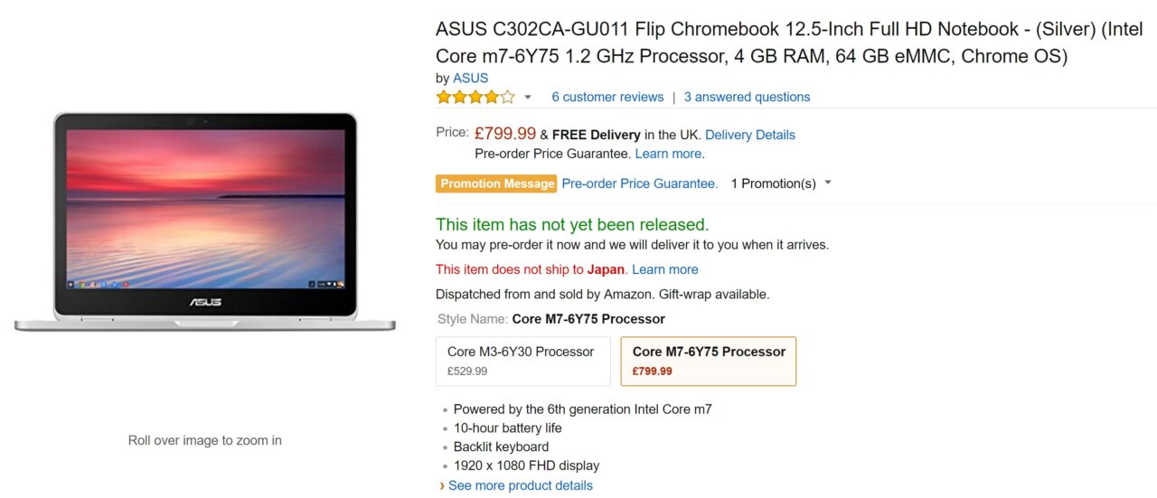 そしてついに “Core m7 プロセッサ” を搭載したモデル「Chromebook Flip C302CA-GU011」が英国の Amazon.co.uk に登場し予約が開始されました。発売日などは今のところ未定です。また RAM は 4GB の 64GB 内部ストレージ仕様となります。残念ながら 8GB RAM ではありません。