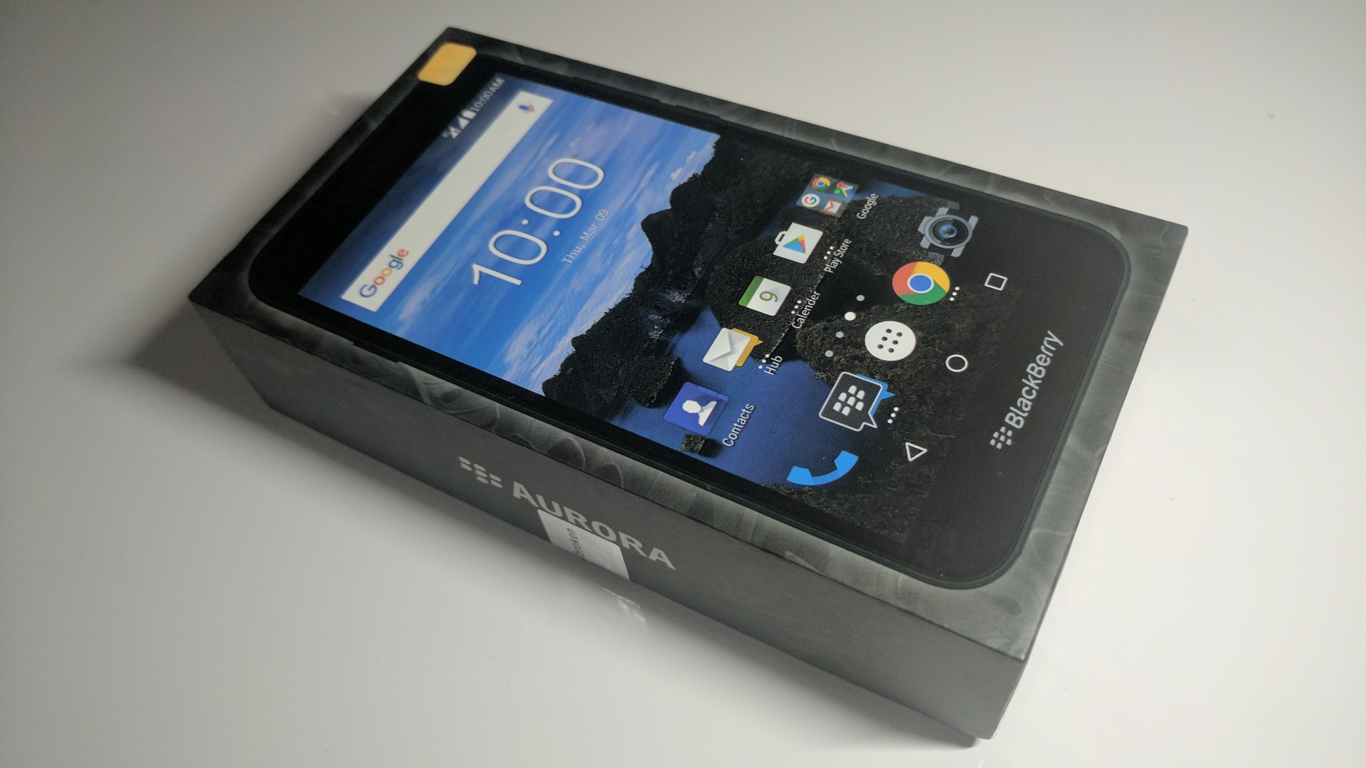 これまでインドネシア現地から開封動画が多数公開されているのでご覧になっている方も多いかと思いますが、「BlackBerry Aurora」のパッケージは特に何の変哲もありません。ごく普通です。