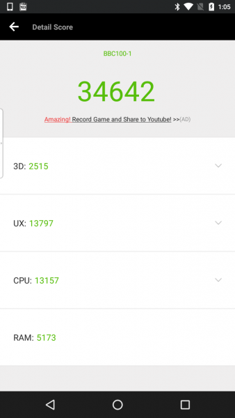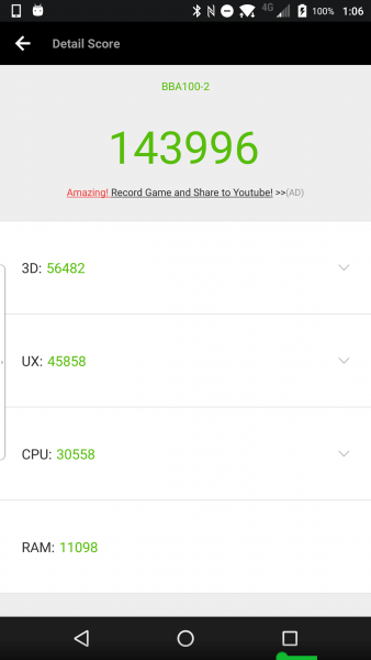 個人的にベンチマークで数値の比較するのはあまり好きではないのですが、一応「AnTuTu」でベンチマークテストをしてみました。「DTEK60」のベンチマークテスト結果と比較しています。