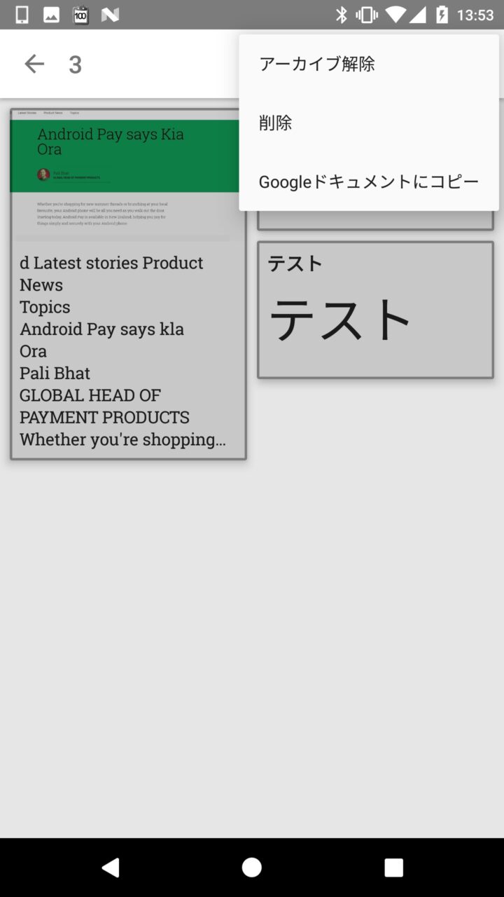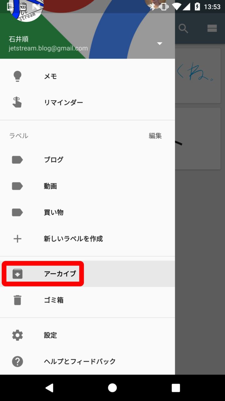 このほかアーカイブにしたメモは右上のメニューアイコンをタッチして表示される “アーカイブ” 内に格納されるので、アーカイブを解除してメモの一覧表示に復帰されることもできます。