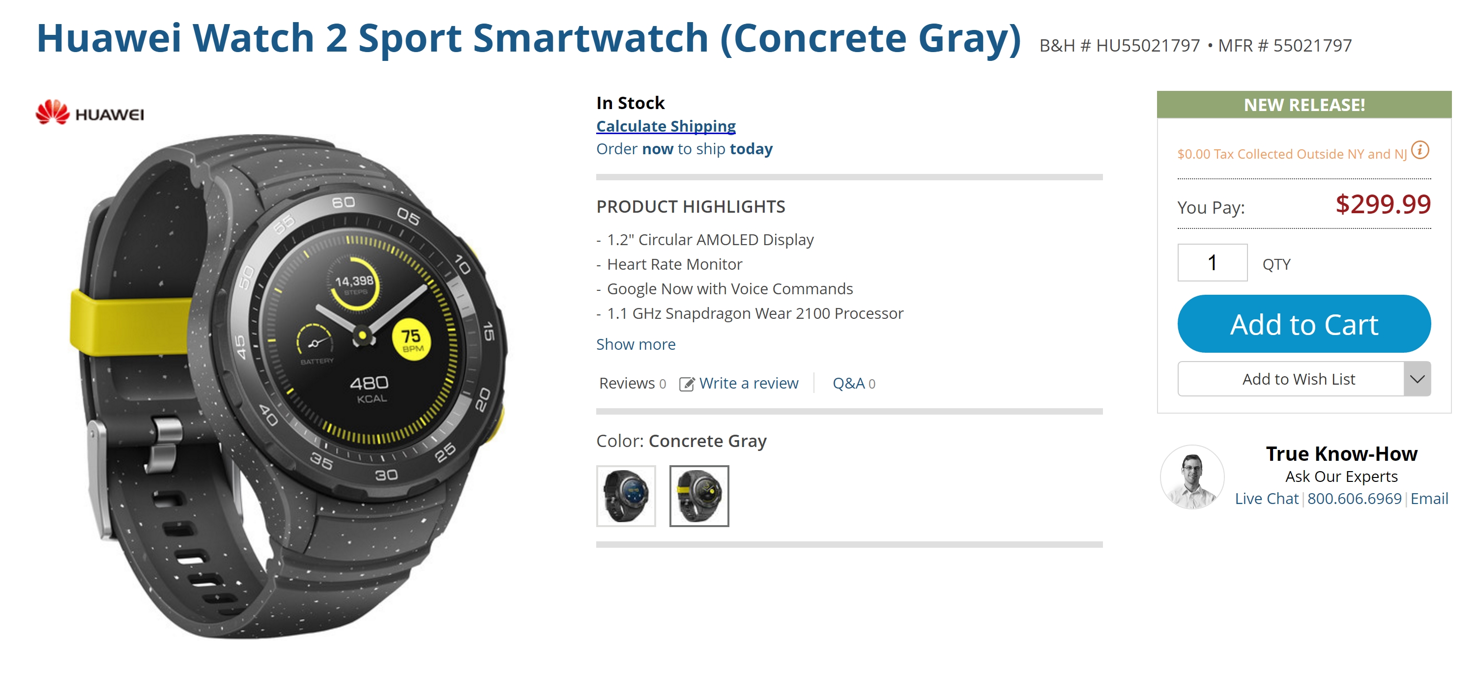 ちなみに B&H での「Huawei Watch 2」の本体価格は公式と同じく $299.99 です。