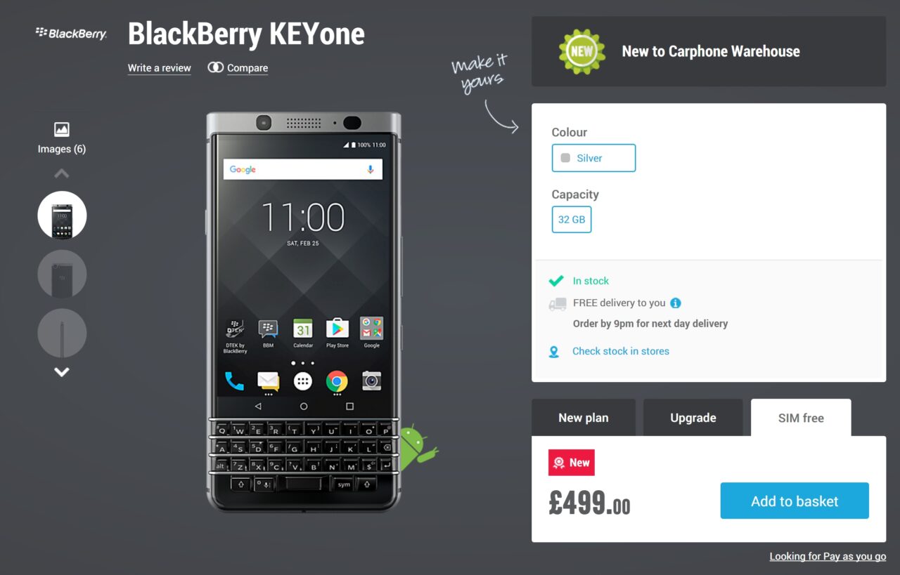 また Carphone Warehouse は日本への直送に対応していないので、直輸入することはできません。輸入する場合は現地の転送業者などを利用する必要があります。ちなもに Carphone Warehouse での「BlackBerry KEYone」の本体価格は VAT 込 £499 です。