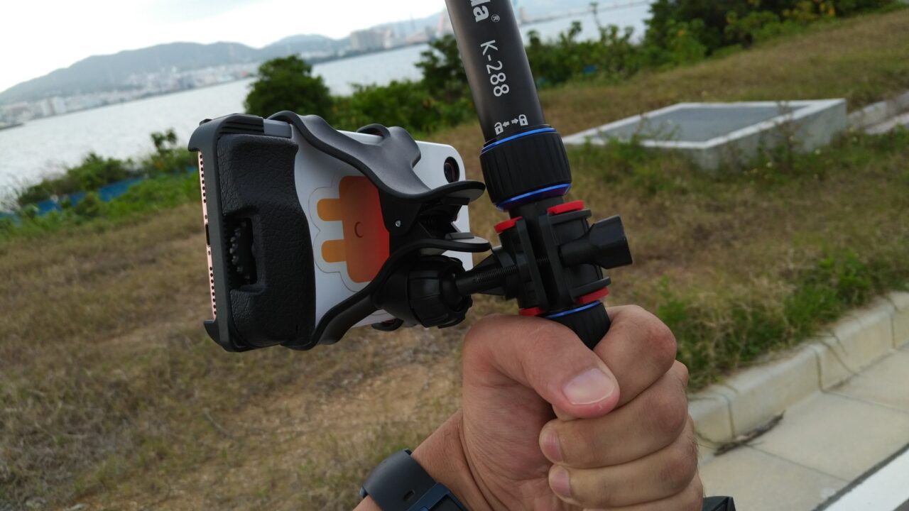 ポイントはスマートフォンホルダーを無段階の可変式にした点。これにより、例えばモノポッドを顔より高く持った場合に iPhone を下向きにできるので、画面を見ながらシャッターボタンを押すことができます。またスマートフォンを縦にも横にも固定することができます。