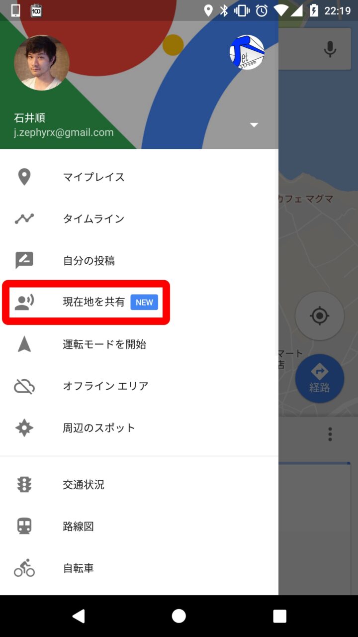 「Google マップ」の “現在地を共有” の基本的な使い方はまず、「Google マップ」アプリを開いてメニューアイコンをタッチするか、ユーザーの現在地を示す青いアイコンをタッチします。そして表示される “現在地を共有” をタッチします。