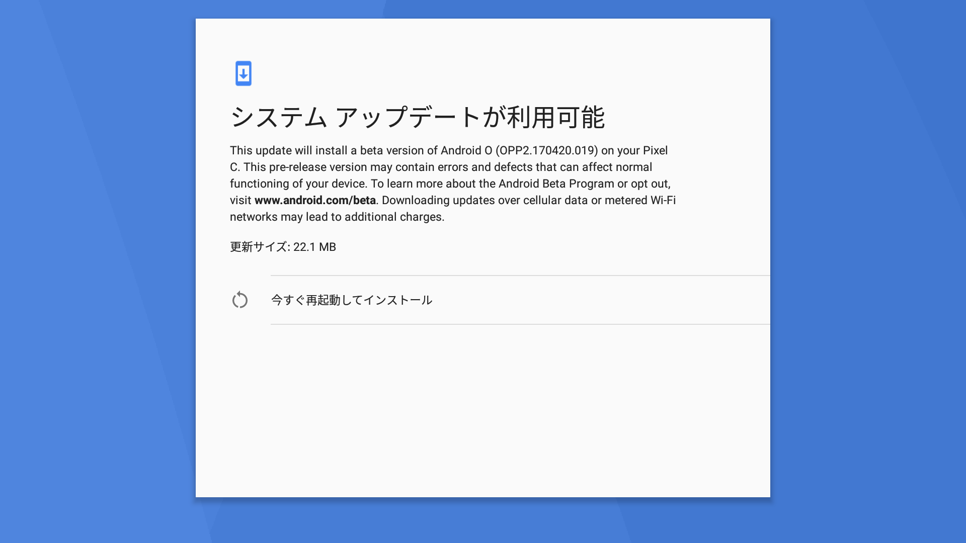 アップデートは OTA での配信となります。私は手持ちの「Pixel C」と「Pixel XL」でアップデートの確認をしました。