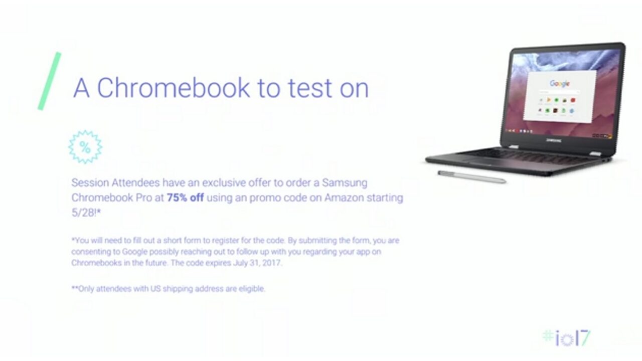 5 月 18 ~ 20 日まで米国マウンテンデューにある Google 本社で Google I/O 2017 が行われましたが、その参加特典として 5 月 28 日に米国で発売される Samsung の新型 Chromebook「Chromebook Pro(XE510C24-K01US)」が 75% 引きとなるプロモーションコードが配布される模様です。
