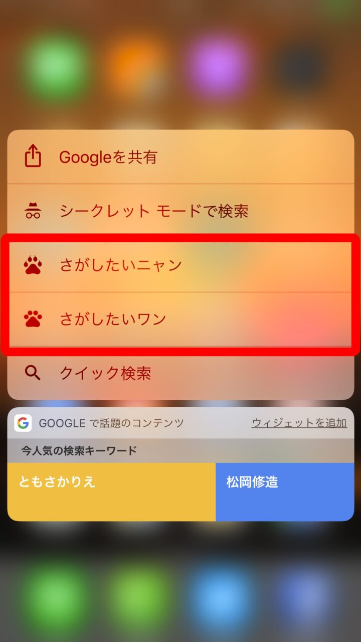 iPhone 版「Google」アプリに新搭載されたネコちゃんワンチャン用に最適化された検索 “さがしてニャン” と “さがしてワン” は、ドロワーに表示される「Google」アプリのアイコンを 3D Touch でタッチすることによりメニューが表示されるので、ネコちゃん用に “さがしてニャン”、ワンチャン用に “さがしてワン” をそれぞれタッチし、更に表示される肉球アイコンをタッチすることでそれぞれのペットにあった商品などの画像が表示されます。
