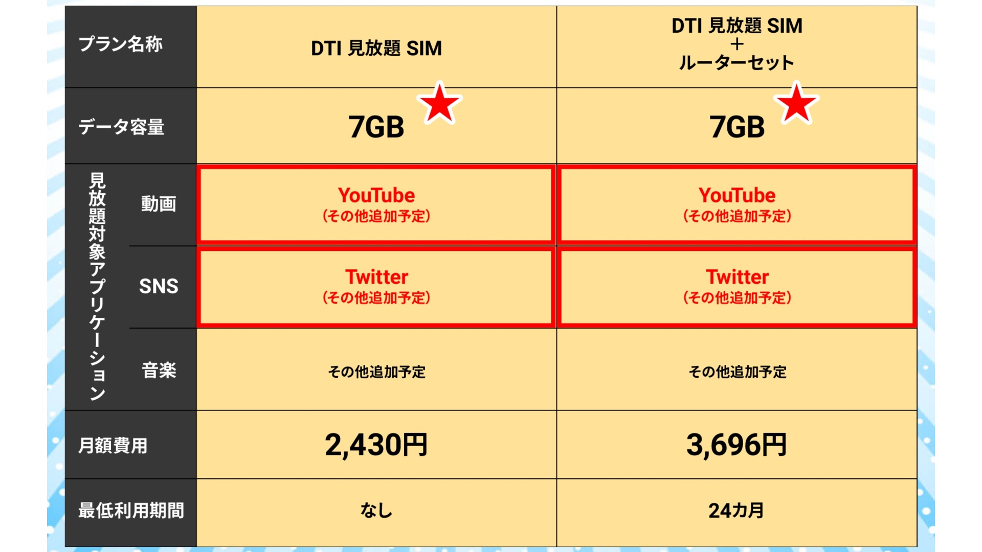 「DTI 見放題 SIM」はオプションではなくカウントフリー機能が実装された新プランです。まずは「YouTube」と「Twitter」がカウントフリーの対象となりますが、今後対象サービスは拡大されている予定です。