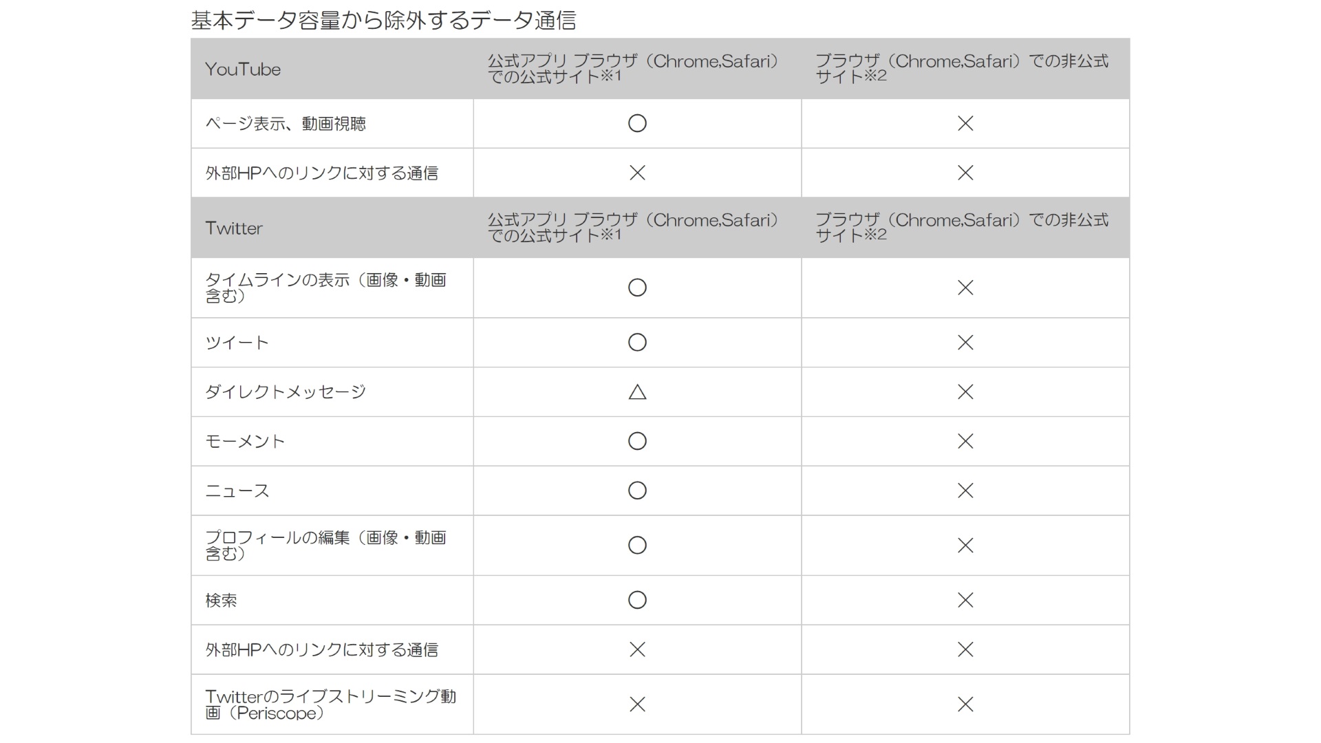 このほか対象となるサービスのスマートフォン公式アプリの “アプリ内ブラウザ” 機能で、対象外サービスのホームページなどを開く場合もカウントフリーにはなりません。紛らわしい場合は “アプリ内ブラウザ” を OFF にしておくことをオススメします。