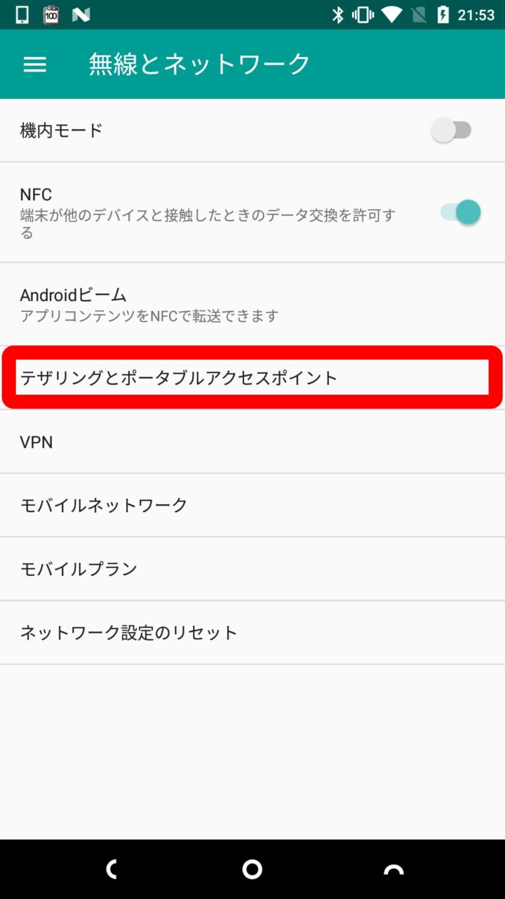 テザリングを行うにはまず Android のテザリング設定を確認し、必要に応じて設定を変更します。テザリングの項目は Android の設定を開き、“無線とネットワーク” カテゴリの中にある “テザリングとポータブルアクセスポイント” などの項目をタッチして開きます。
