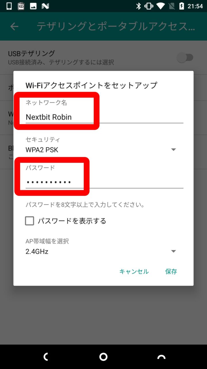 “ネットワーク名” と “パスワード” は忘れないようにしてください。“ネットワーク名” と “パスワード” を再設定、もしくは確認したら “保存” をタッチします。