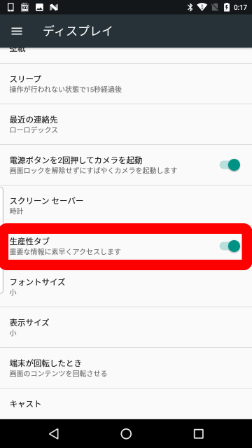 もし「生産性タブ」タブを一旦削除して再表示する場合は、Android の設定から “ディスプレイ” をタッチして “生産性タブ” のスイッチを ON にすれば再表示できます。