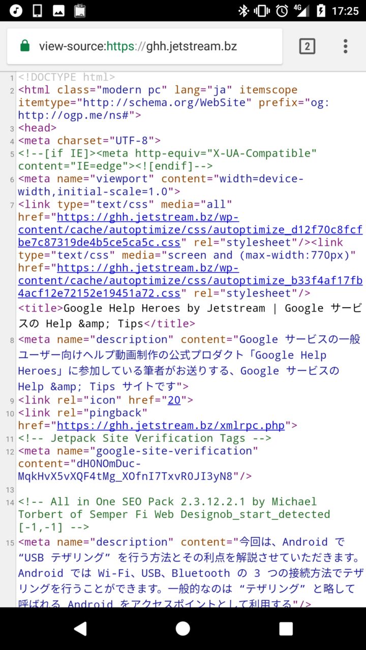 例えば当サイトの URL は “https://jetstream.news/” なので、アドレスバーに “view-source:https://jetstream.news/” と入力して表示します。すると当サイトのソースコードが表示されます。