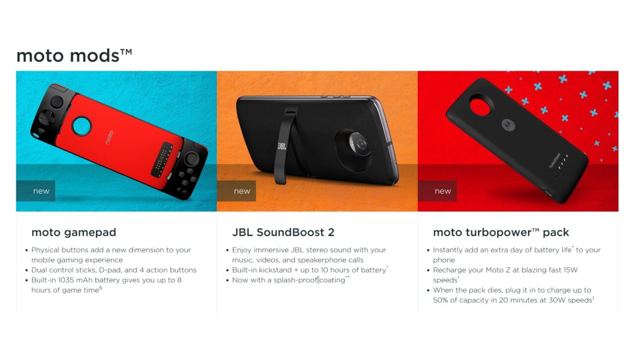 1,035mAh バッテリー内蔵の Bluetooth ゲームパッドの「Moto Gamepad」、新世代の「JBL SoundBoost 2」、3,490mAh バッテリー内蔵の「Moto Turbopower pack」、ワイヤレスチャージングに対応した「Moto Style Shell With Wireless Charging」です。