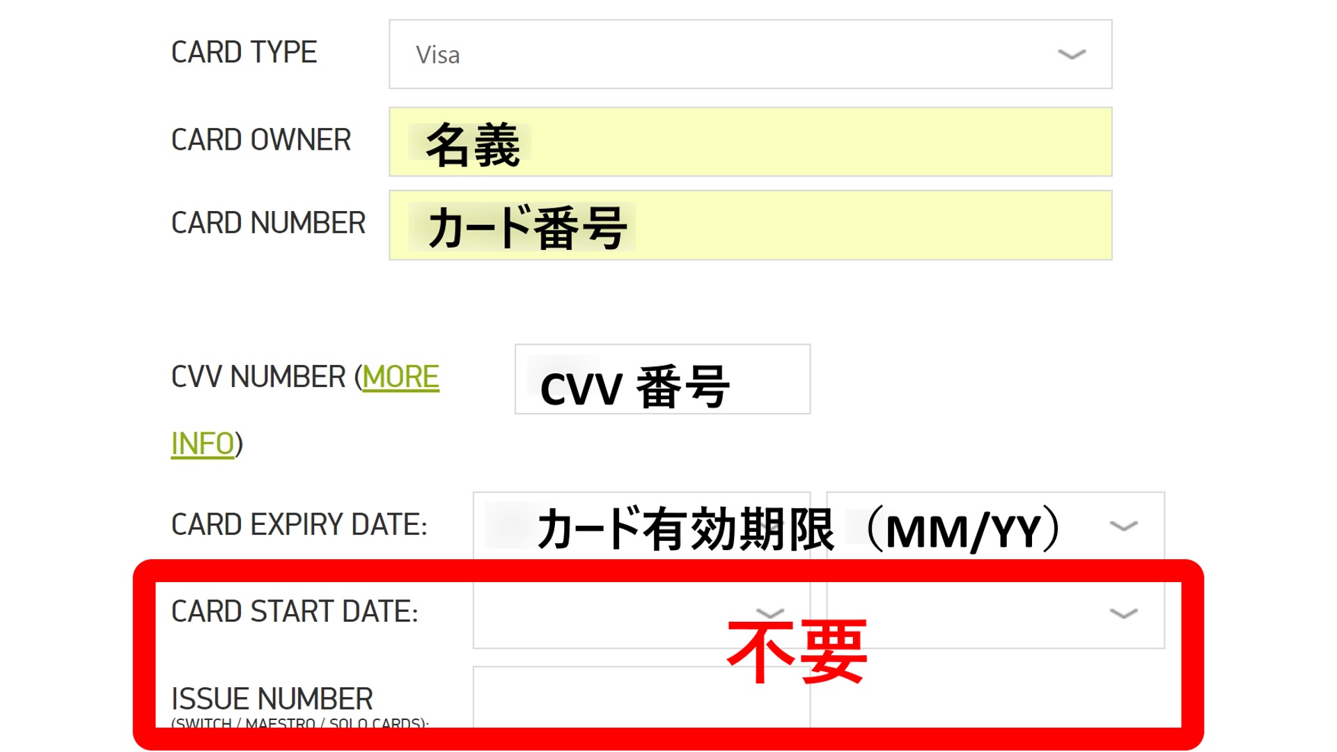 “不要” と記載した “CARD START DATE” と “ISSUE NUMBER” は空欄のままで OK です。