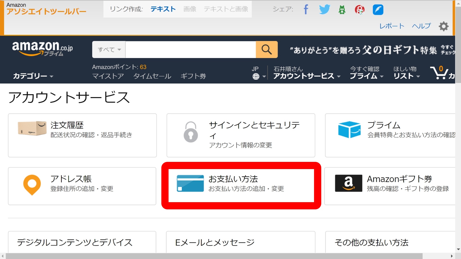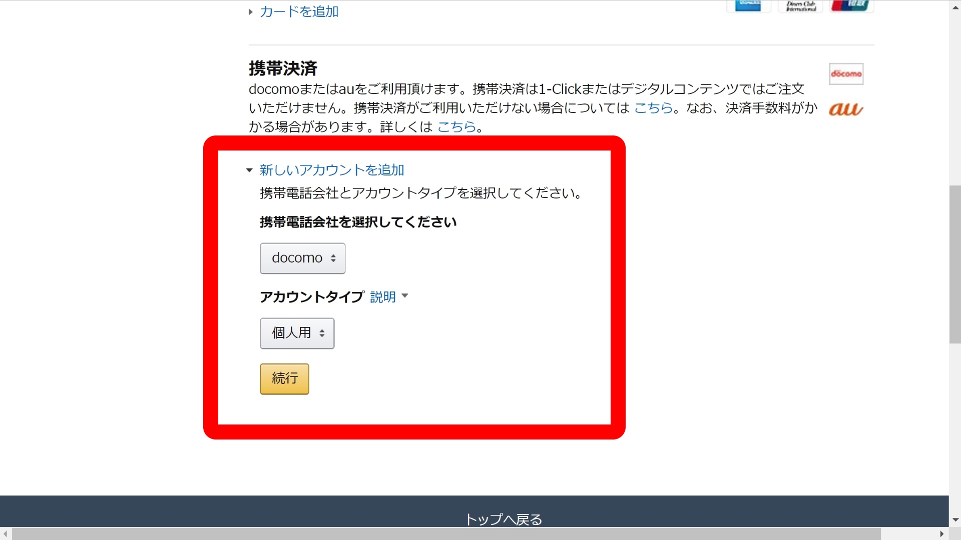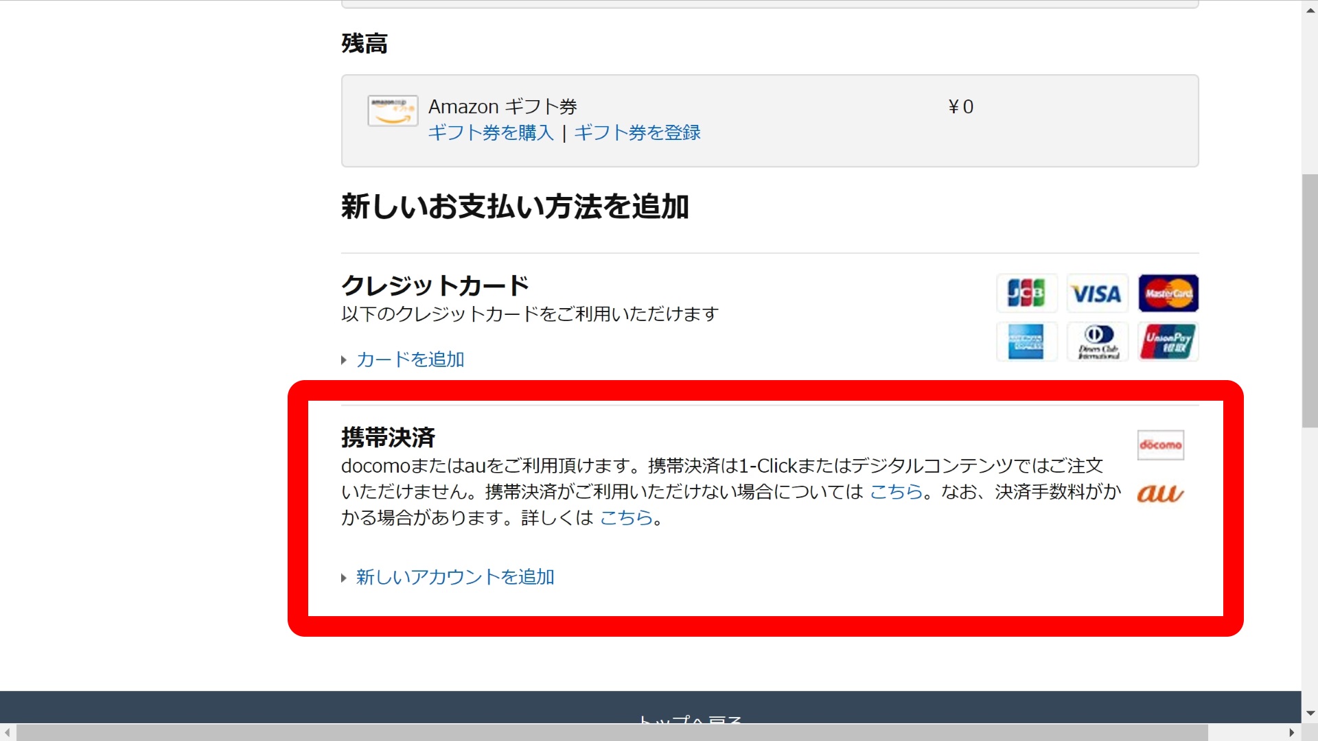 実際に「ドコモ ケータイ払い」及び「au かんたん決済」を追加する方法は、Amazon の “アカウントサービス” から “お支払い方法” を選択し、表示されるページの “携帯決済” にある “新しいアカウントを追加” をクリックします。