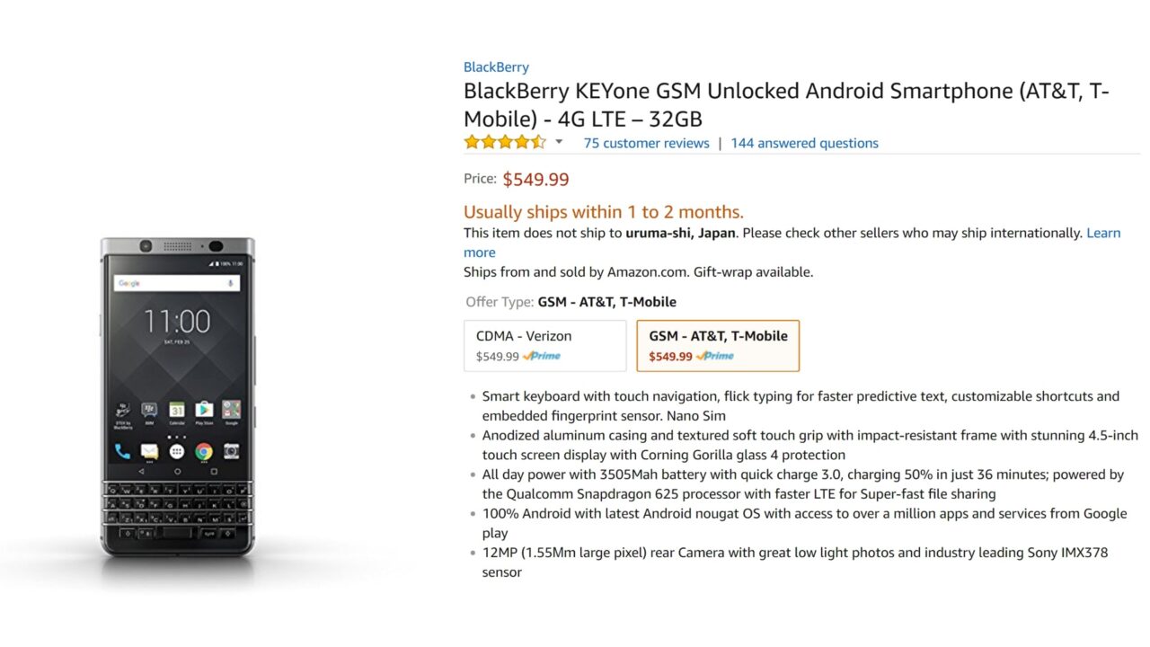 米Amazon、「BlackBerry KEYone(BBB100-1)」出荷予定が早まる