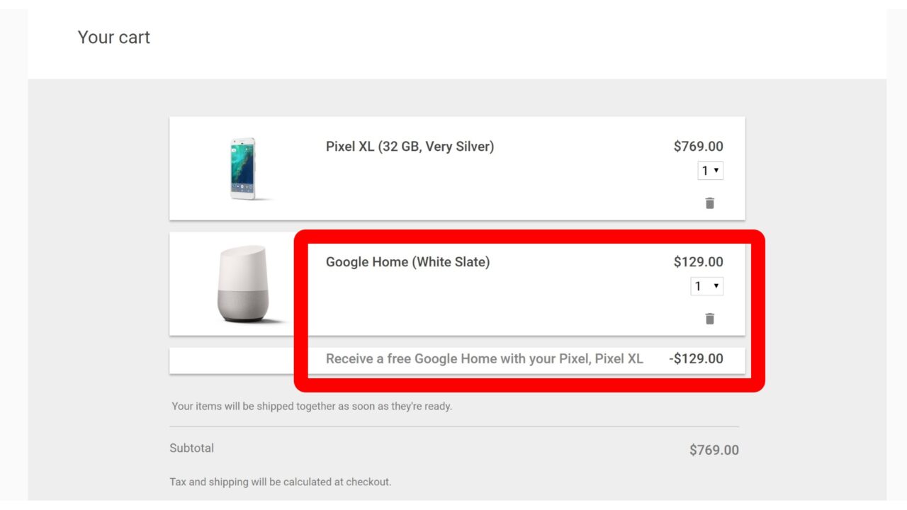 今回の特別オファーは、「Pixel XL」と「Google Home」をカートに入れておくと、精算時に「Google Home」分の $129 が割引され、「Google Home」が実質無料となる仕組みです。