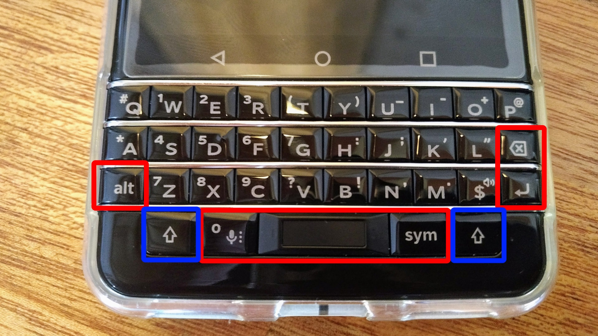 「KEYone」の物理キーボードには文字キーのほかに “Alt” “ディクション” “スペース” “Sym” “Enter”“バックスペース”、そして 2 つの “Shift” が搭載されています。