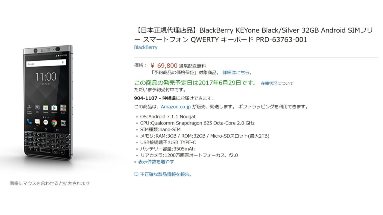 6 月 21 日夜にフライングで MVNO SIM とのセットとなる「BlackBerry KEYone(BBB100-6)」国内モデルの予約が Amazon で開始されましたが、本体のみの予約も、明けて 6 月 22 日 0 時より同じく Amazon で開始されました。