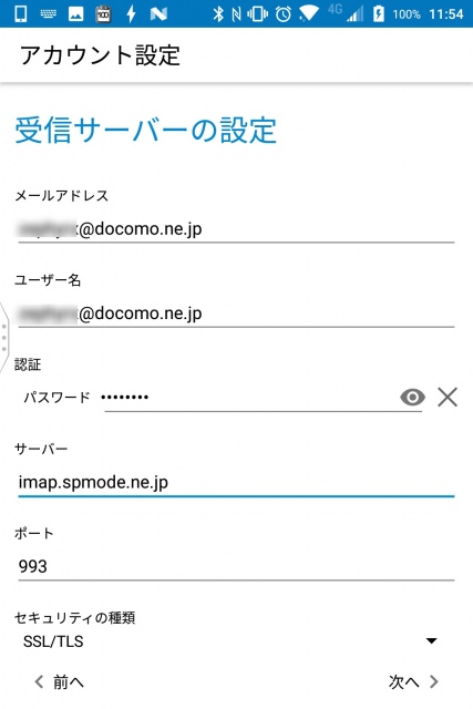 次に受信サーバーの設定です。メールアドレスとアカウント名は特に変更不要かと思います。パスワードはご自身のものを入力してください。