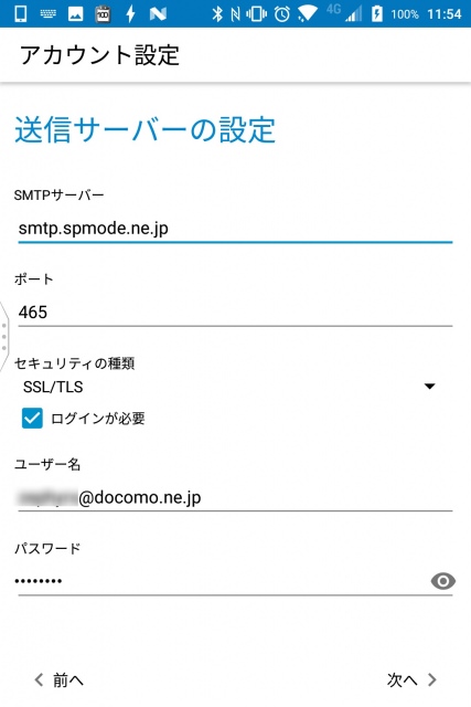 “次へ” をタッチしたら送信サーバーを設定します。情報は以下の通り。