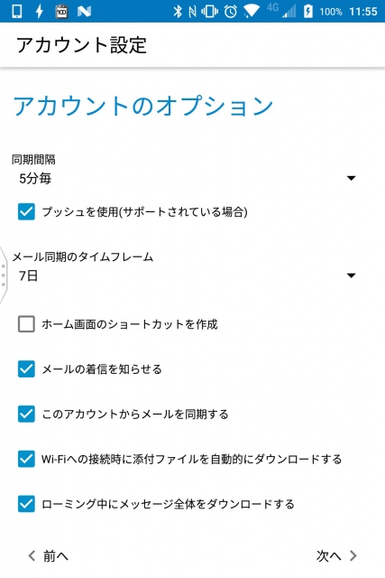 アカウントの同期間隔などを設定してて “次へ” をタッチしします。同期間隔の最短は 5 分で、「Gmail(最短 15 分)」よりも短い間隔を設定することが可能です。