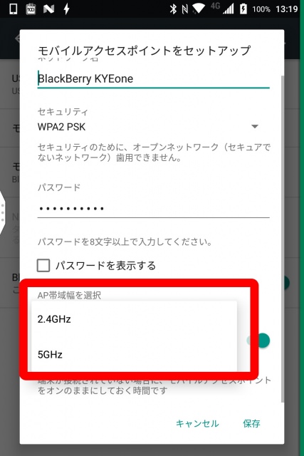 このほか「KEYone」のテザリング機能はアクセスポイントの帯域幅も、2.4GHz と 5GHz から選択することができます。