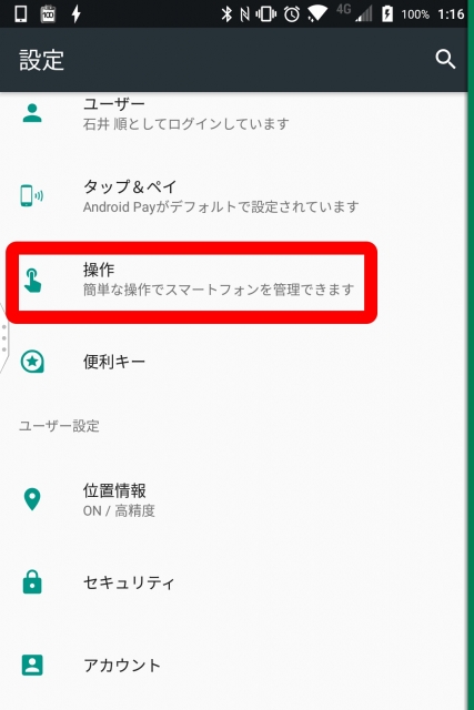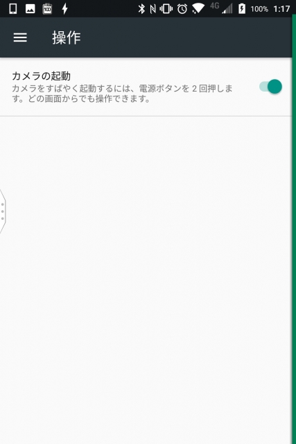 ちなみにもし電源ボタン 2 回押しでのカメラ起動が不要な場合は、「KEYone」の設定を開いて、“端末” セクションの下の方にある “操作” をタッチすることで、“カメラの起動” のスイッチが表示されるので、それを OFF にすれば OK です。