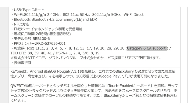 実は以前、「BlackBerry Priv」国内モデルを発売したときは LTE Band 19 対応の国内ローカライズ仕様となっていて、元々海外の「Priv」が現地の CA に対応していたこともあったので、もしかしたら「Priv」国内モデルも国内の CA に対応している可能性があるかもと思い FOX に問い合わせたところ、『キャリアアグルゲーションとはなんでしょうか?』みたいな返答だったことがあります。