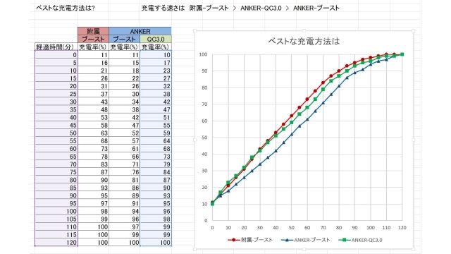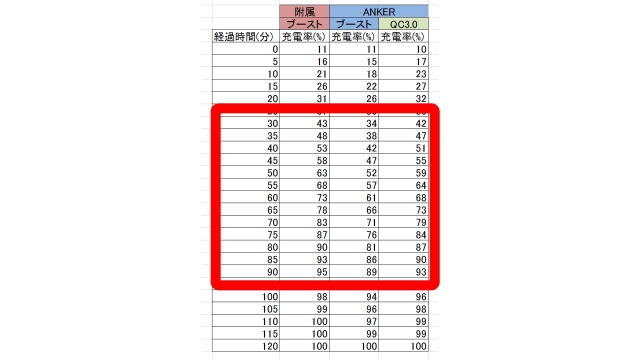 QC3.0 よりも純正充電器 +「ブーストモード」の方が優れているという結果はかなり興味深いですね。純正充電器 +「ブーストモード」は充電開始 30 ~ 90 分くらいの間が特にその威力を発揮していることがわかります。