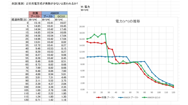 この電圧比較からわかることは QC3.0 が最初電圧がかなり高めな割に、充電効率はそこまで良くないということです。これにより QC3.0 を利用した場合は最初、比較的発熱する可能性があることがうかがえます。