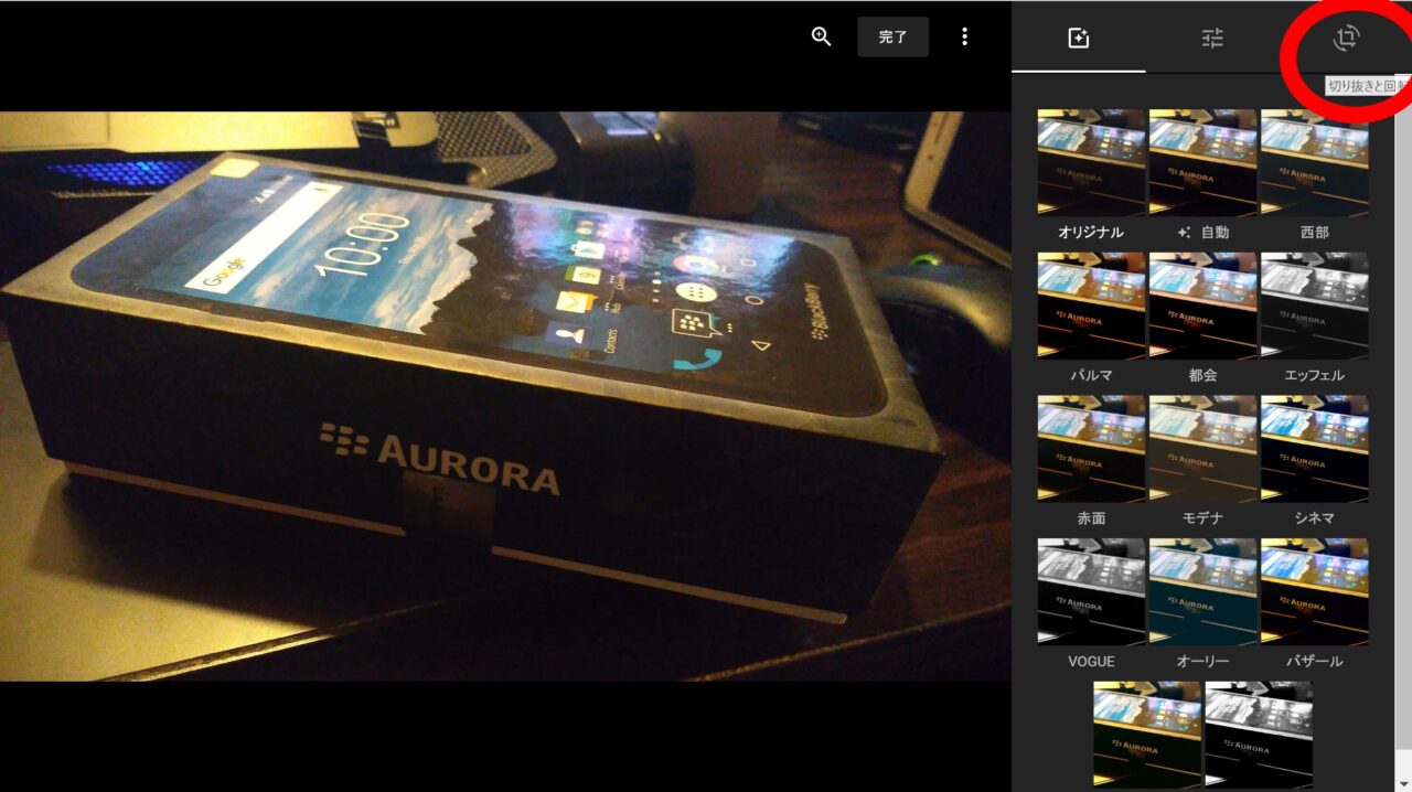 また傾き補正を保ったままマウスのドラッグで写真の位置を調整することも可能です。終わったら “完了” をクリックすることで “切り抜きと回転” が終了し編集モードのトップ画面に戻りますがこの状態ではまだ写真は保存されません。