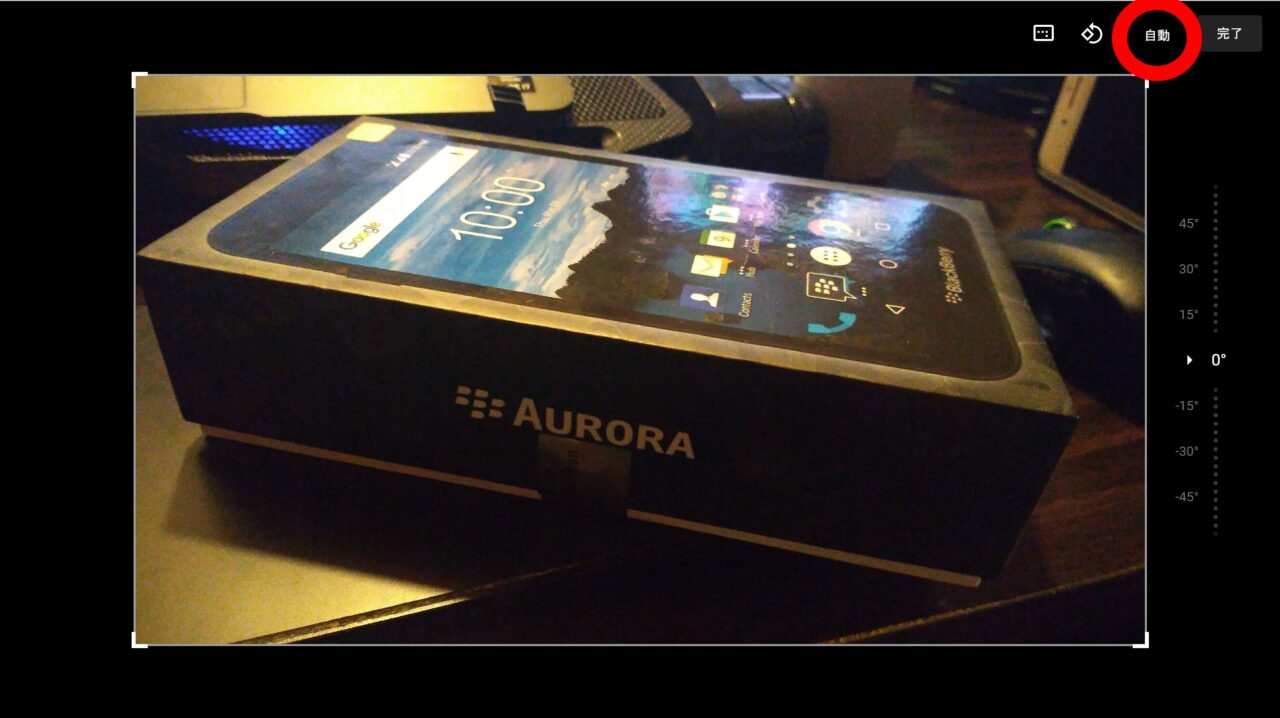 そして表示されるメニューの中から “自動” をクリックすると写真に写る被写体に合わせて傾きが自動補正されます。この傾き自動補正を行った後は当然元の写真サイズよりも小さくなります。