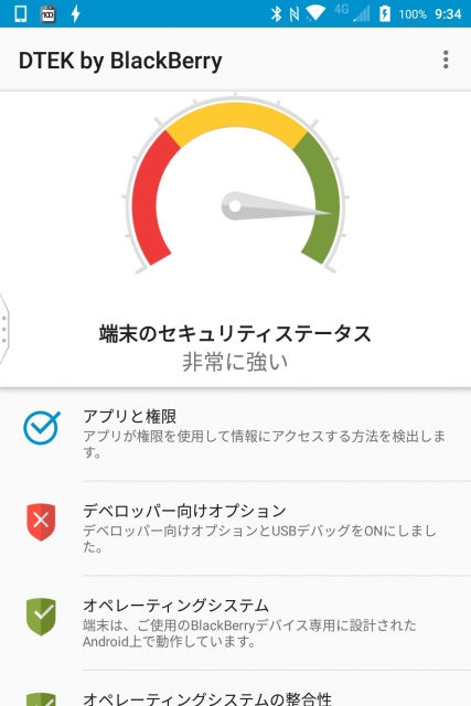 画面ロックや端末の暗号化など、セキュリティに直結する各設定が行われているかどうかを一か所にまとめて、そして判定を行い、「KEYone」のセキュリティレベルがどの程度かをわかりやすく表示してくれます。