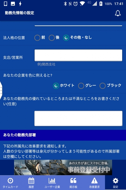 また「ブラゼロ」アプリをインストールして会員登録した旨や、もし就業に関する何らかの問題が発生した場合などの「改善要求」連絡を、匿名で勤務先にメールや FAX で通知を送信することもできます。