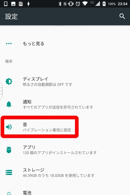 「KEYone」の設定を開いて、“端末” カテゴリにある “音” をタッチします。
