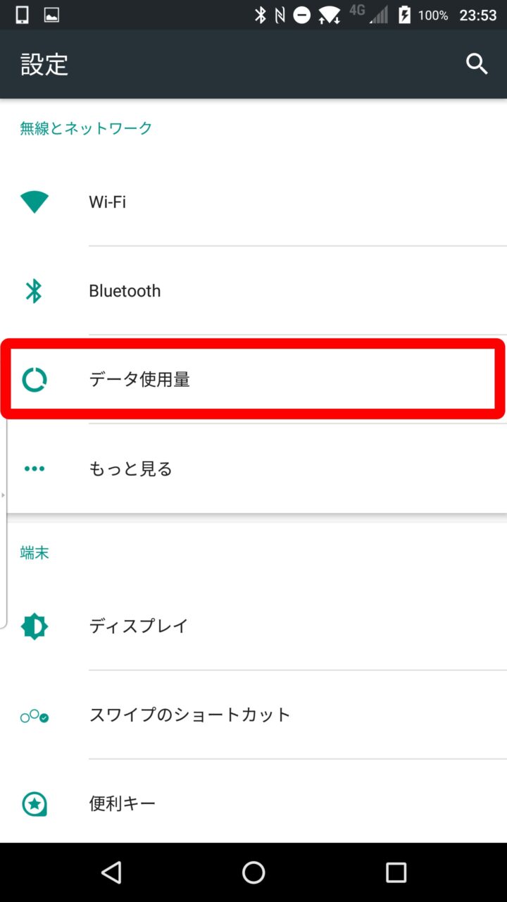 Android のモバイルネットワーク通信を オフ にする方法は、まず Android の設定を開き、“無線とネットワーク” カテゴリ にある “データ使用量” や “データ使用” などの項目をタッチします。