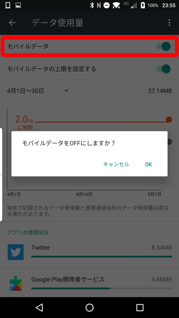 表示された “データ”使用量” ページ一番上の “モバイルデータ” のスイッチを オフ にして進みます。これで Android のモバイルネットワーク通信が オフ になります。