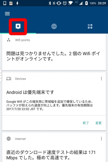 「Google Wifi」アプリから初期設定を行うことはもちろん、メッシュネットワーク構築の際の設定を行ったり、Wi-Fi 接続を行う際の一時的な電波優先機種を設定したり、はたまたネットワークの状態を確認したりスピードテストを行うことができます。