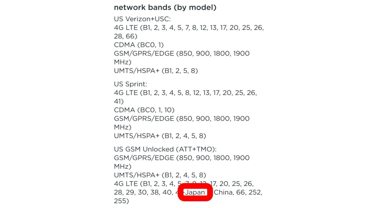 その記載があった部分は、スペックシートのモバイルネットワークの対応周波数部分です。ここにしっかりと “Japan” の文字がありました。しかも日本向けモデルは LTE Band 66 / 252 / 255 もサポートする模様です。