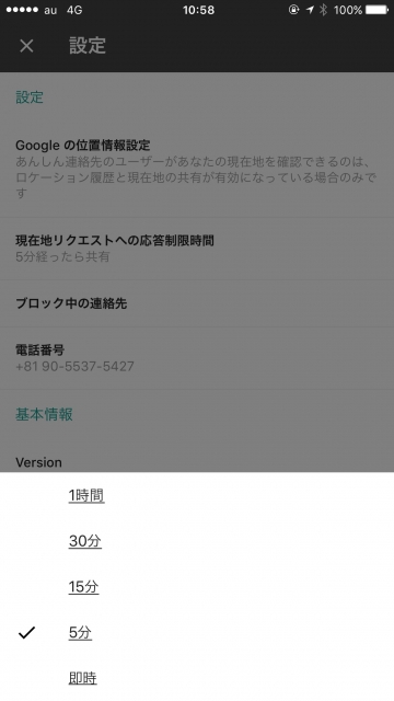 「あんしん連絡先」で相手の位置情報をリクエストした際に、これまでは 5 分以内に応答がなかった場合に強制的に位置情報が相手に知らされていたのですが、この時間を、即時 ~ 1 時間の間で設定出来るようになりました。