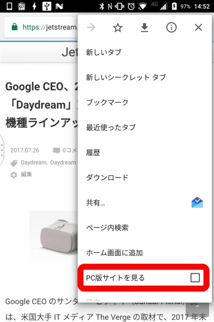 ちなみに Android 版の「Chrome」では以前より、メニュー項目内に表示される “PC 版サイトを見る” のチェックボックスで、PC 表示とモバイル表示の切り替えを行うことができます。