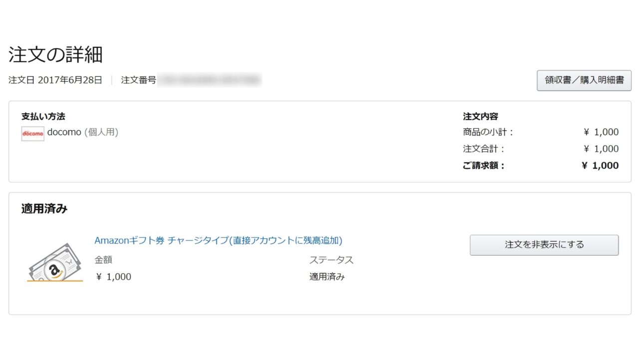 エントリー後、Amazon での買い物時に「ドコモ ケータイ払い」を利用すると、買い物金額に対する10% 分の「d ポイント」が 2017 年 10 月上旬にプレゼントされます。Amazon での「ドコモ ケータイ払い」の利用方法は以下の記事を参考にしてください。