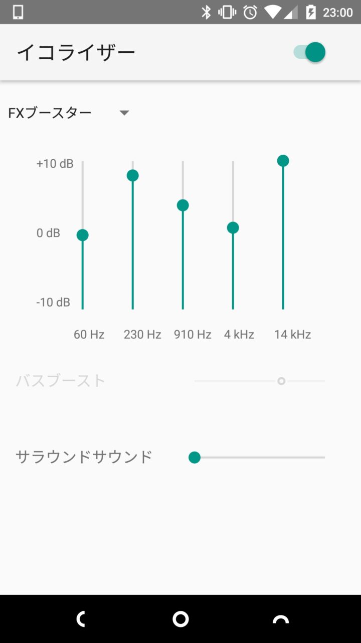 また、イコライザー機能には、“バスブースト” と “サラウンドサウンド” の調整機能も実装されています。