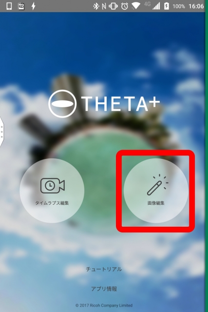 次に「THETA+」アプリを起動し、“画像編集” をタッチします。