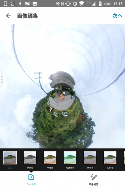 良い角度が決まったら右上の “次へ” をタッチ。“フィルタ” の適用と “画像補正” を行うことができる “画像編集” 画面に切り替わるので、好きなように写真に効果を付けます。