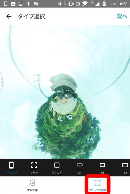 完了したら更に “次へ”。“タイプ選択” に切り替わります。“タイプ選択” では編集した写真を 360 度写真として使用するか、通常の平面写真として使用するかを選択することができます。